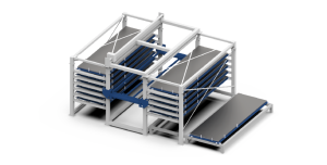 A Unidade de Armazenamento (Double Row) é um sistema de armazenamento tridimensional concebido para organizar e guardar chapas metálicas e outros materiais de fabrico. O sistema inclui o corpo principal do armazém, um elevador, bandejas para materiais, um dispositivo de alimentação frontal e elementos opcionais de segurança. A estrutura de “duas filas” de armazenamento permite maior capacidade em menor espaço e facilita a integração com outros equipamentos da linha de produção.