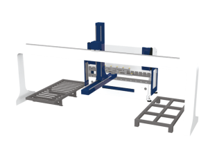 Este sistema permite uma produção eficiente e repetível, melhorando a qualidade do produto final e reduzindo o esforço manual. O robot e as ferramentas adotam tecnologias avançadas (como ventosas de sucção e prensas pneumáticas) permitindo processar peças de grandes dimensões e múltiplos formatos até 60 kg por placa. O sistema possui sensores posteriores para posicionamento preciso e funções de separação e identificação de chapas em dupla camada, garantindo segurança e eficiência na produção.